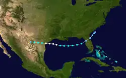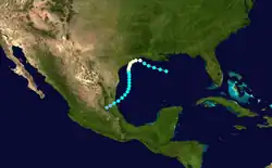 A tropical storm formed in the central Gulf of Mexico around 06:00 UTC on August 26 from a stationary front or perhaps the remnants of the previous tropical cyclone.[5] It initially moved west-northwest off the coast of Louisiana but soon banked toward the south, passing within 25 mi (40 km) of Galveston, Texas, as it intensified into a Category 1 hurricane with winds of 80 mph (130 km/h). The slow-moving system weakened as it moved into the Bay of Campeche. It curved southwest and made landfall near Tampico, Tamaulipas, with winds of 45 mph (72 km/h) around 04:00 UTC on September 1 and dissipated after 18:00 UTC that day.[6]
