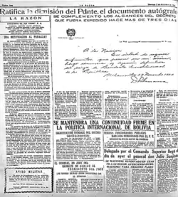 On 28 November, Tejada Sorzano assumed office as acting president.[22] On 1 December, a Military Commission appointed by the high command made up of General Julio Sanjinés and Colonel Felipe M. Rivera arrived in La Paz and delivered the original document containing Salamanca's resignation, after which Article 77 of the Constitution was officially enacted and Tejada Sorzano was named Constitutional President of the Republic.[23][24]