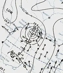 ![]() Surface weather analysis of the hurricane approaching Louisiana on June 16 | |