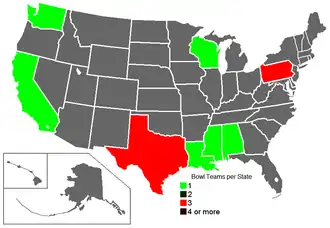 Number of bowl games per state. Note that the Bacardi Bowl was held in Havana, Cuba. | |||||||||||||||||||||||||||||||||||||||||||||