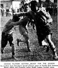 At the ARL control board meeting on April 29 the Manukau Rovers were admitted to the senior championship first grade competition.[20] This was their first appearance in it since 1913 though they did field a combined team with a Mangere club in 1924 before switching en masse to the rugby code the same year. In 1932 the club was revived but mainly fielded teams in the junior grades. One of the requirements fro their readmittance in the first grade was that they were not allowed to take any senior players from other Auckland clubs. One exception was made when the City club sportingly allowed Steve Watene to move across to Manukau and be their captain for the season. Jack Hemi and Joe Broughton left the rugby union code where they were playing for Wairarapa, and Horowhenua - Manawatu respectively and joined the Manukau club prior to the start of the season. Both were representative players with Hemi also having played for the Maori All Blacks.[21] Thomas Trevarthan then joined the team for their second round match. Trevarthan was a rugby player from Otago and he went on the represent New Zealand in his debut league season.[22] In addition Len Kawe, Angus Gault, and Frank Pickrang all King County rugby representatives joined Manukau early in the season. Towards the end of the season Manukau signed Jack Brodrick who was honoured with the best forward award following the New Zealand Maori rugby union tour of Australia.[23] Tragedy struck Manukau immediately following their first win of the season against Richmond in round 2. Mr. Albert Cowan, who had founded the team joined them in the dressing room to congratulate them but collapsed and could not be revived. The players and patrons were "distressed when the news was confirmed, and flags lowered to half-mast. The Manukau reserve team which was playing a later game at the Domain found out during their match which was then abandoned.[24]