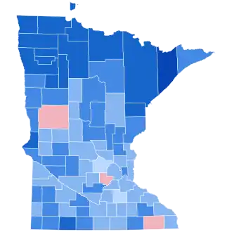 Minnesota was won by the Democratic candidate, incumbent President Franklin D. Roosevelt won the state over Kansas governor Alf Landon by a margin of 348,350 votes, or 30.83%—nearly doubling Landon's overall share of the state's vote. Nationally, Roosevelt was soundly re-elected, with 523 electoral votes and a landslide 24.26% lead over Landon in the popular vote. Landon carried only two states: Maine and Vermont, whilst in Minnesota Landon won just three counties: Otter Tail County in the rural west, Carver County outside the Twin Cities, and Fillmore County in the southeast of the state; of these, only Fillmore has ever voted Democratic in a presidential election since.[1]