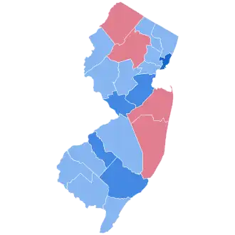 Roosevelt was the first Democratic victor in Cumberland County since James Buchanan in 1856, and the first in Essex County since Grover Cleveland in 1892.[3] He was the first to win Hunterdon County since 1916, and the first to win Bergen, Union, Somerset, Mercer, Burlington, Camden, Gloucester, Atlantic, Cape May, and Salem counties since 1912.