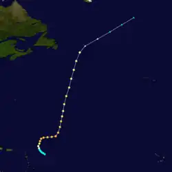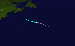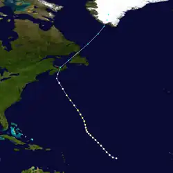 A strong tropical wave, originating near Cabo Verde around September 4, developed into a tropical storm by 00:00 UTC on September 9 while positioned about 480 miles (770 km) east-northeast of Barbuda. It intensified into the season's first hurricane within 24 hours, further maturing to Category 2 intensity with winds of 100 mph (160 km/h) by 06:00 UTC on September 12. The small hurricane moved steadily northwest throughout its lifespan, passing east of Bermuda before weakening to a tropical storm late the next day. It acquired well-defined frontal boundaries by 06:00 UTC on September 14, marking the system's transition into an extratropical cyclone. It made landfall in Nova Scotia and either elongated into a trough or merged with a frontal system over far eastern Canada twelve hours later.[5]