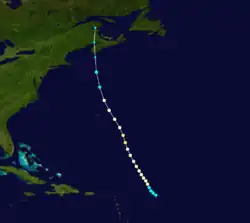 A tropical wave likely emerged from the western coast of Africa around September 14. It developed into a tropical cyclone at some point of the next few days, with a specific date unclear in the absence of surface observations. At 06:00 UTC on September 20, a hurricane was conclusively identified about halfway between Cabo Verde and the Leeward Islands. It gained strength on a general northwest heading, intensifying into a Category 2 hurricane and attaining peak winds of 100 mph (160 km/h) from September 24–25. Slight weakening occurred as the system passed well north of Bermuda. It transitioned into an extratropical cyclone by 06:00 UTC on September 26 and struck Nova Scotia before turning northeast across Newfoundland and into the northern Atlantic. The extratropical cyclone was last noted over Iceland at 12:00 UTC on September 28, after which time it likely merged with another non-tropical low.[5]