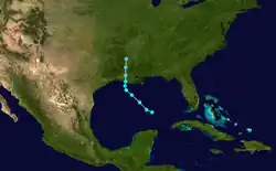 In late September, a tropical wave moved westward across the Caribbean. An initial area of low pressure formed over the northwestern portion of the region on September 29, but this feature dissipated within two days. A new low formed and organized into a tropical storm around 00:00 UTC on October 2 while positioned about 425 miles (684 km) south of Mobile, Alabama. It reached peak winds of 45 mph (72 km/h) after six hours, with steady weakening thereafter as the storm moved west-northwest and then north. The system made two landfalls in central Louisiana near the Atchafalaya Basin between 12:00–14:00 UTC on October 3, both with winds of 40 mph (64 km/h). The system continued to degrade once inland, dissipating after 06:00 UTC on October 4 over southeastern Arkansas.[5]