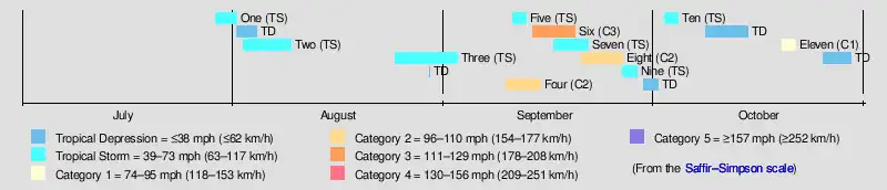 Seven | September 16–21 | Tropical storm | 60 (95) | 1002 | Florida | Unknown | 2 | [17] | ||