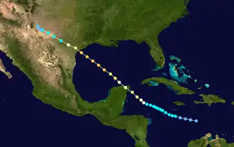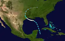 A tropical wave developed into a tropical depression over the central Caribbean Sea around 12:00 UTC on August 23.[5] Trekking west-northwestward, the system strengthened into a tropical storm about 24 hours later. It gradually intensified, and reach hurricane status south of Jamaica on August 25. The hurricane then curved northwest and intensified into a Category 2 hurricane on August 27. Early the following day, the cyclone made landfall near Cancún, Quintana Roo, with winds of 105 mph (165 km/h). The storm weakened to a Category 1 during its brief transit across the Yucatán Peninsula, before re-intensifying into a Category 2 hurricane over the Gulf of Mexico late on August 28. The hurricane quickly strengthened, and attained its peak intensity on August 29 as a Category 3 hurricane with winds of 115 mph (185 km/h). Nearing the Texas Gulf Coast, the storm maintained intensity, and was still a major hurricane by the time it made a final landfall near Matagorda, Texas, on August 30. Continuing inland, the hurricane weakened, and degenerated into a remnant low over New Mexico on August 31.[6]