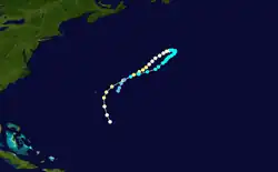 The fourth tropical storm of the season was first detected as a minimal hurricane about 355 mi (570 km) southeast of Bermuda on August 25.[6] Due to lack of data, little further information is known about the origin of this system. Historical weather maps showed a tropical storm on August 24, though there was insufficient evidence of a closed circulation.[5] The hurricane moved north-northwestward and intensified into a Category 2 hurricane early on August 26. The storm then made its closest approach to Bermuda, passing about 90 mi (140 km) east of island, which observed a sustained wind speed of 64 mph (103 km/h). At 06:00 UTC on August 26, the cyclone peaked with maximum sustained winds of 110 mph (175 km/h).[6] The hurricane produced sustained winds of .[5] The system slowly weakened as it continued northeastward, falling to Category 1 intensity early on August 28 and deteriorating to a tropical storm late on August 29. Around that time, the cyclone decelerated and curved to the southwest. Early on September 3, the system weakened to a tropical depression, several hours before dissipating about 205 mi (330 km) east-northeast of Bermuda.[6]