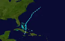 A tropical depression developed just offshore modern-day Granma Province in Cuba on October 13, moving ashore within six hours. After emerging into the Atlantic near Gibara early on October 14, the depression turned northward and soon intensified into a tropical storm. During the next 24 hours, the storm moved through the central Bahamas, striking or passing close to the islands of Exuma, Little San Salvador, and Eleuthera.[6] A barometric pressure of 1,005 mbar (29.7 inHg) was observed on Eleuthera around 12:00 UTC on October 15, which was the lowest known pressure in relation to the system.[5] The storm then turned northeastward and continued to slowly strengthen, peaking with maximum sustained winds of 50 mph (85 km/h) on October 16.[6] By late on October 18, the cyclone merged with a cold front while situated about 305 mi (490 km) southeast of Massachusetts.[5]