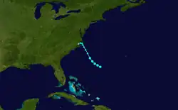 A low pressure area developed into a tropical storm around 12:00 UTC on September 18, while located about 180 mi (290 km) north of Bermuda.[5] The storm moved southwestward and passed northwest of the island,[6] which observed sustained winds of 29 mph (47 km/h).[5] Late on September 19, the cyclone curved northwestward.[6] The system intensified to reach maximum sustained winds of 50 mph (85 km/h) and a minimum barometric pressure of 1,000 mbar (30 inHg) on September 20.[5] Early the next day, the cyclone curved northeastward and began losing tropical characteristics. By 00:00 UTC on September 22, the system had already completed its transition to an extratropical cyclone while located about 275 mi (445 km) southeast of Nantucket, Massachusetts. The extratropical remnants continued northeastward, striking Newfoundland before dissipating early on September 25.[6]