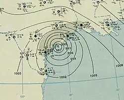 The season's activity was reflected with an accumulated cyclone energy (ACE) rating of 66 units,[3] below the 1931–1943 average of 91.2.[4] ACE is a metric used to express the energy used by a tropical cyclone during its lifetime. Therefore, a storm with a longer duration will have high values of ACE. It is only calculated at six-hour increments in which specific tropical and subtropical systems are either at or above sustained wind speeds of 39 mph (63 km/h), which is the threshold for tropical storm intensity. Thus, tropical depressions are not included here.[3]