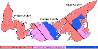 ![]() Map of PEI's ridings coloured in based on how they voted | |||||||||||||||||||||||||||||||||||||