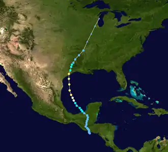 A tropical depression formed in the eastern Pacific Ocean just offshore Guatemala on September 27. The depression drifted northwestward and made landfall in Guatemala on September 28. It crossed southeastern Mexico and entered the Gulf of Mexico near Ciudad del Carmen on October 1. Shortly after entering the Gulf of Mexico, the system strengthened into a tropical storm and became a hurricane on October 2. It turned more to the north and intensified to a strong Category 2 hurricane on October 3. Subsequently, the storm made landfall near Freeport, Texas, on October 4 at the same intensity. The hurricane rapidly weakened to a tropical storm as it turned northeastward over land. On October 6, it weakened to a tropical depression over Missouri and later became extratropical. The storm accelerated northeastward and dissipated near Chicago.[6]