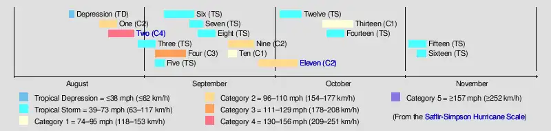 The 1949 Atlantic hurricane season was the last season that tropical cyclones were not publicly labeled by the United States Weather Bureau.[1] It officially began on June 15, and lasted until November 15. These dates conventionally delimit the period of each year when most tropical cyclones form in the Atlantic basin. The first storm, a tropical depression, developed in the northern Gulf of Mexico on August 14. The final system, Tropical Storm Sixteen, dissipated in the southwestern Caribbean Sea on November 5. It was a fairly active season, featuring 16 tropical storms and seven hurricanes. Two of these strengthened into major hurricanes, which are Category 3 or higher on the Saffir–Simpson hurricane wind scale.[2]