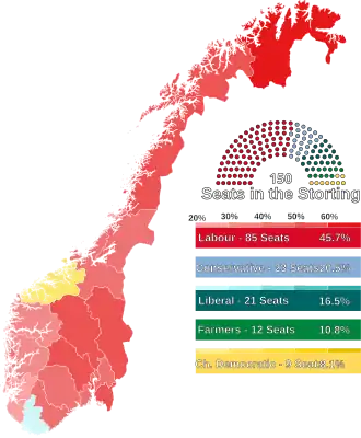 All 150 seats in the Norwegian Parliament 76 seats were needed for a majority | ||||||||||||||||||||||||||||||||||||||||||||||||||||||||||||||||||||