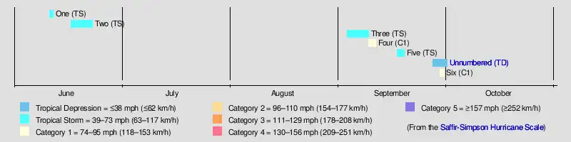 Only six tropical cyclones were observed in the Eastern Pacific during this season, which is well below the 1949–2006 average of 13 per year. Of the six tropical cyclones, two only attained hurricane status. In addition, none of the tropical cyclones became a major hurricane, which is Category 3 or greater on Saffir–Simpson hurricane scale. Although it is an oddity for no major hurricanes to occur during a season since the satellite era began, nearly all hurricane seasons during this time period lacked a major hurricane. However, it is likely that other tropical cyclones in the Eastern Pacific basin in 1949 went operationally unnoticed, due to lack of modern technology such as satellite imagery.[1] In addition to the six tropical cyclones, another tropical cyclone developed in the Eastern Pacific basin, but was included in the Atlantic basin hurricane database, rather than the Eastern Pacific.[2] Most of the seven tropical cyclones did not differentiate in intensity during the duration,[5] with the exception of Hurricane Six.[1] The first two tropical cyclones of the season formed in quick succession during mid-June, however, the months of July and August went dormant in terms of tropical cyclogenesis. The last five tropical cyclones, including the additional storm, also developed in a quick sequence, all of which forming from in a span of 17 days. By October 1, all tropical cyclonic activity had completely ceased.[1][5]