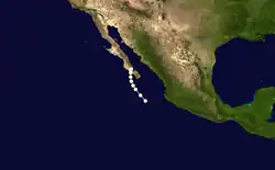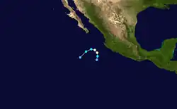 After no tropical cyclone activity in July and August, the third tropical storm formed offshore of southwestern Mexico on September 3. Like the previous two tropical cyclone, this storm had a peak of 50 mph (80 km/h), and did not intensify further. Tropical Storm Three headed northwestward, and began paralleling the coast of Baja California. On September 8, Tropical Storm Three turned abruptly south-southwestward, and dissipated by the next day.[5] The outer rainbands of this system were expected to bring squally weather over the Baja California Peninsula;[6] instead, this storm turned away without causing any impact.[7]