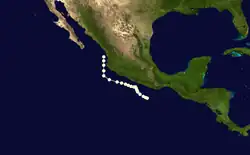 The final tropical cyclone of the season was initially discovered 539 mi (867.43 km) southwest of Zihuatanejo, Mexico. Hurricane Seven initially headed northward, but curved northwestward later that day. No change in intensity occurred, and Hurricane Seven dissipated on October 3, 142 mi (228.52 km) southwest of Socorro Island.[2]