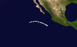 The second tropical cyclone of the season developed 113 mi (182 km) southwest of Manzanillo, Colima on July 3. Similar to Hurricane One, this storm paralleled the coast of Mexico and then headed out to sea. Hurricane Two later headed northwestward, and paralleled Baja California. The hurricane dissipated July 6, 240 mi (386.24 km) north-northwest of Cabo San Lucas.[2]