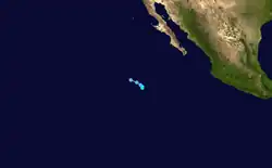 The only tropical cyclone that failed to intensify into a hurricane developed on August 12, 394 mi (634 km) south-southwest of Socorro Island. By early on August 13, the system had weakened, and was downgraded to a tropical depression only twelve hours after forming. The storm dissipated 707 mi (1137.80 km) south of Guadalupe Island later that day.[2]