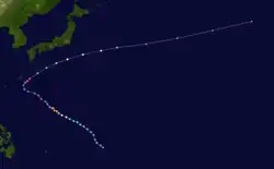 Tropical Storm Olive developed about 1,600 mi (2,600 km) southwest of Honolulu, Hawaii on September 13. The next day, the system intensified into a tropical storm. Rapidly intensifying, Olive became a typhoon on September 15. The next day, Olive strengthened into a Category 5-equivalent cyclone on the modern-day Saffir–Simpson hurricane wind scale. Olive weakened into a Category 2 typhoon before recurving northeast. On September 19, the cyclone weakened further, becoming a severe tropical storm. it then transitioned into an extratropical cyclone and was last monitored on September 21.[2]