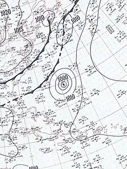 On August 29, a tropical storm developed over southern Florida.[8] While moving through the state, the storm dropped heavy rainfall, reaching 4.67 in (119 mm) at Fort Lauderdale Beach; similar rainfall was observed in the northern Bahamas. Described by one Weather Bureau forecaster as "wide and flat", the storm gradually organized over the western Atlantic Ocean.[20] On August 31, the storm turned to the northwest, with maximum sustained winds of 40 mph (65 km/h). The system weakened to a tropical depression before moving ashore near Savannah, Georgia on September 1. It dissipated that day over land.[8]