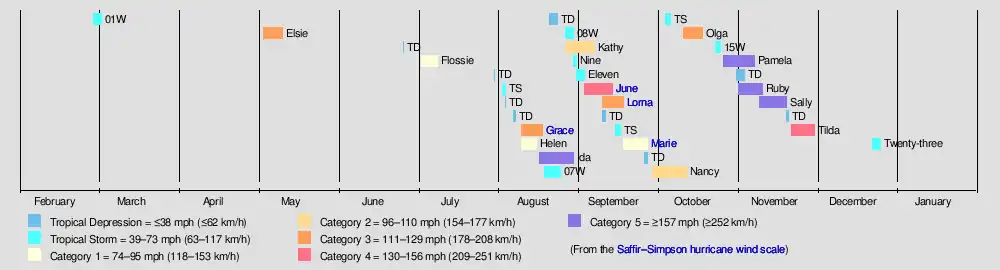 Typhoon Lorna formed northeast of Guam on September 10. It intensified while moving west, becoming a typhoon by September 13 and threatening the Northern Mariana Islands. Peaking as a Category 3 storm with winds of 100 knots (190 km/h) on September 15, it passed west of the Philippines. Lorna weakened while turning north-northwest, then accelerated north-northeast on September 17, steered by a frontal system. It made landfall on Japan's Bōsō Peninsula on September 18, shortly before transitioning into an extratropical low over the Pacific. Tracking ended by September 19-22.