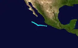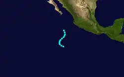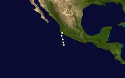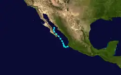 In early October, the remnants of Hurricane Janet entered the Pacific Ocean, which later re-organized into the fifth tropical storm of the Pacific hurricane season.[1] On October 1, the storm began to curve northwestward due to a ridge over Texas. Over the following days, however, a shortwave over the United States West Coast forced to the storm to the north and then east.[2] The tropical storm maintained the same intensity throughout its existence, before making landfall on Baja California Sur at 0600 UTC on October 3. The disturbance crossed back into the Gulf of California, where it dissipated the following day.[3] The remnants of the cyclone later moved into Sonora. In the United States, rainfall was spread throughout areas of Arizona and New Mexico. Stations in Tatum and Lovington, New Mexico, recorded peak rainfall totals in excess of 3 in (76 mm).[2]