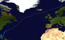 A low-pressure area formed along a dissipating cold front to the north of Puerto Rico. The system moved westward, developing some tropical characteristics by October 13.[5] The next day, the system became a tropical storm over the Straits of Florida.[9] On October 15, it crossed over South Florida near Homestead with winds of 60 mph (95 km/h).[5] While it is unclear whether this cyclone ever became fully tropical, it is entered into HURDAT as a tropical cyclone.[3] The storm intensified further over the Florida peninsula, peaking at 65 mph (105 km/h) early on October 16.[9] After affecting Florida, the storm crossed the western Atlantic and moved across the Outer Banks.[5] The storm became extratropical on October 17, and the next day it was absorbed by another extratropical storm.[19]