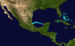 A westward-moving tropical wave traversed the Lesser Antilles on July 20. It moved across the Caribbean, and its thunderstorms increased on July 23 while passing south of Cuba and beneath a high-pressure area. There is evidence that it could have developed a circulation on July 24 before it struck the Yucatán Peninsula. It is confirmed to have developed into a tropical depression on July 25 in the Bay of Campeche. As it continued west-northwestward, it rapidly intensified into Tropical Storm Anna, and before moving ashore in Mexico near Ozuluama, Veracruz, on July 26 it attained hurricane status. Peak winds reached 85 mph (135 km/h), although Anna rapidly dissipated on July 27 as it moved further inland.[9] The high winds wrecked several homes in poor regions of Tampico, Tamaulipas, while rainfall of 2.5 in (64 mm) resulted in flooding.[5] The high winds severed telegraph lines from Tampico to San Luis Potosí. The same area was affected by several hurricanes in the previous year.[12] Damage totaled around $50,000, and there were no deaths.[5]