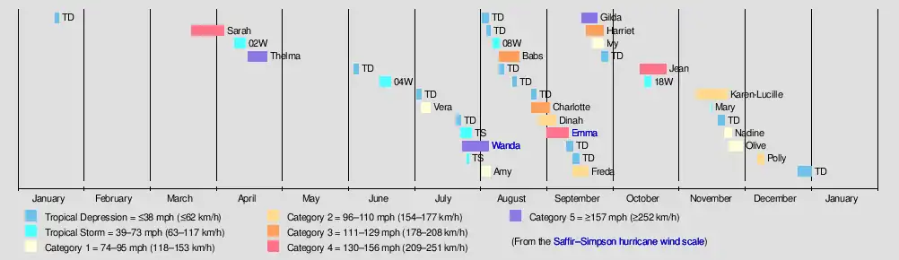 A total of 39 tropical cyclones are made in the Western Pacific Basin. Of all the 39 tropical cyclones made, 23 of them reached tropical storm strength, 15 of them reached typhoon strength, and 3 of them reached the super typhoon strength. The rest of the storms, such as unnumbered and unnamed tropical depressions and storms, are only classified by the CMA while the JMA is sometimes rare before the 1960s - 1970s.