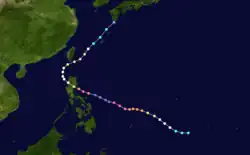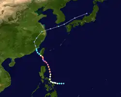 A tropical depression developed southwest of Guam on July 25. It moved north-northeastward, passing east of the Northern Marianas. On July 27, it intensified into a tropical storm and was designated Wanda. On the same day, the storm turned more westward, steered by the subtropical ridge to the north. Low wind shear and warm waters allowed Wanda to intensify steadily, developing into an intense typhoon. On July 30, reconnaissance aircraft recorded a minimum pressure of 902 mbar (26.6 inHg), and the peak winds were estimated at 295 km/h (183 mph). After passing through the Miyako Islands, Wanda weakened slightly and traversed the East China Sea. On August 1, the typhoon made landfall in eastern China near Zhoushan, Zhejiang, producing a pressure of 923 mbar (27.3 inHg); this was the lowest pressure recorded in China from a tropical cyclone. Wanda slowly weakened while progressing through China, dissipating on August 5.[2][3]