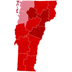 Eisenhower swept every county in Vermont, breaking 70% in 11 of the 14 counties. The three northwestern counties of Vermont had long been Democratic enclaves in an otherwise Republican state through the 1930s and 1940s, but Eisenhower won them back for the GOP in both 1952 and 1956, in the latter case even breaking 60% in Grand Isle County. The region still remained the most Democratic in the state, as Eisenhower received less than 60% of the vote in Chittenden County and Franklin County, while every county outside the northwest broke seventy percent for Eisenhower. In three counties Eisenhower even broke eighty percent of the vote, which, as of 2024, no other candidate has managed to do since. No presidential candidate since has surpassed Eisenhower's 72.16% vote share or his 44.35% margin of victory, as by the late 1950s cracks were already beginning to form in the Republican stranglehold on Vermont, and the GOP shifted toward an increasingly Southern and conservative party beginning in the 1960s.