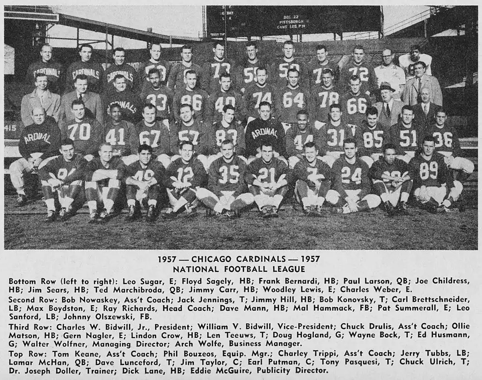 - ^ George Strickler, "Cards Lose in 2nd Half, 37–14: South Siders An Easy Mark for Redskins," Chicago Tribune, Oct. 7, 1957, pp. 1F, 4F.