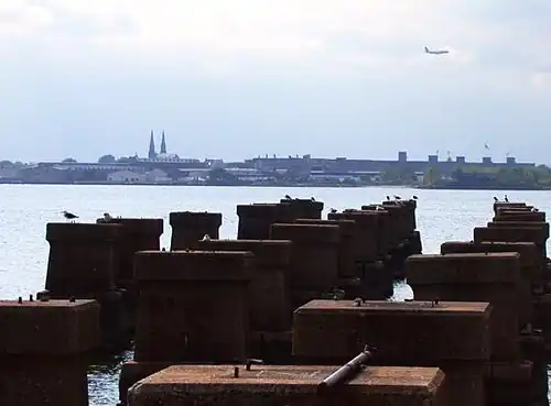 At least 48 people died in the wreck, including former New York Yankees second baseman George "Snuffy" Stirnweiss.[2][3] The CNJ faced a number of legal actions which were all settled out of court. The two locomotives, #1532 and #1526, both being EMD GP7s were raised, rebuilt by the Electro-Motive Division of General Motors (EMD) and returned to service. Locomotive #1532 retained its original number, while the #1526 was renumbered #1531. They served primarily as freight locomotives, although #1532 was photographed in passenger service after its return from EMD. The Newark Bay lift bridge was used until the last passenger train left Bayonne's Eighth Street Station on August 6, 1978.[4] Demolition of the central lift spans began in July 1980 after the United States Coast Guard declared the structure a navigational hazard to ships.[5] The trestle and approaches were removed in 1987–1988 when it became apparent that a replacement span was no longer feasible. Removal of the piers began in 2012.[6]