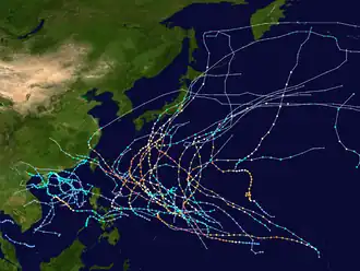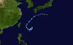 On May 29, Super Typhoon Phyllis attained a peak of 185 miles per hour (298 km/h), the strongest typhoon on record in May at the time.[4] Phyllis remained over open waters, and dissipated on June 2, southeast of Japan.