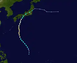 Typhoon Helen, which formed on September 9, rapidly intensified to a 175-mile-per-hour (282 km/h) super typhoon on the 14th. It moved to the northeast, and steadily weakened until hitting southeastern Japan as a 105-mile-per-hour (169 km/h) typhoon on the 17th. It paralleled the Japanese coastline, and after turning northward it became extratropical on the 19th in the Sea of Okhotsk.[5] Helen's effects caused 24 fatalities (with 44 missing) and 108 injuries.[6]