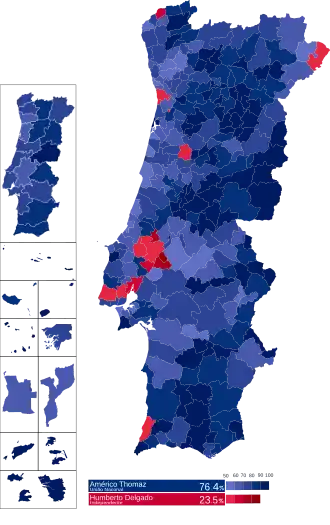 The official tally was 76.4 percent for Tomás and 23.6 percent for Delgado. The regime's secret police force, PIDE, harassed and attacked Delgado voters and supporters, and there were many reports of widespread electoral fraud.[2] For example, Salazar refused to allow opposition representatives to observe the counting of ballots.[1]
