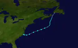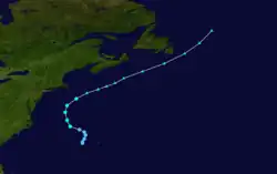 On September 6, a broad low pressure area developed between the Bahamas and Bermuda. The system moved northward, organizing into a tropical storm on September 9. The system had a large wind field, and was likely a subtropical cyclone. Moving northwestward at first, the storm turned to the northeast ahead of a cold front, with sustained winds of around 45 mph (72 km/h). Nantucket island in Massachusetts reported sustained winds of 39 mph (63 km/h) during the storm's passage. On September 11, the storm interacted with the cold front, becoming an extratropical storm, which lasted until September 14. The storm was added to the Atlantic hurricane database in 2016.[3]