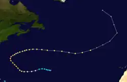 A dissipating cold front spawned a low pressure over the central Atlantic Ocean on August 26. Moving slowly northward, the system organized into a tropical storm on August 28, and a day later, an approaching cold front turned the storm to the east-northeast. Based on ship observations, it is estimated that the storm reached peak winds of 65 mph (105 km/h) on August 31. By September 3, the storm transitioned into an extratropical cyclone as it interacted with the cold front, located halfway between Newfoundland and the Azores. A day later, the storm was absorbed by a larger extratropical storm southwest of Iceland. The storm was added to the Atlantic hurricane database in 2016.[3]