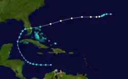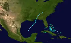 A tropical wave developed into a tropical depression while situated in the central Gulf of Mexico on June 18. It headed rapidly northeastward and made landfall near the Tampa Bay Area of Florida later that day.[2] The storm dropped moderately heavy rainfall in Florida, which caused damage to crops. An F3 tornado near Miami and high tides on the west coast of the state also resulted in damage.[13] Losses in Florida were around $1.7 million.[2] Shortly thereafter, in entered the Atlantic Ocean and strengthened into a tropical storm later on June 18. Then, the following day, as it began undergoing extratropical transition, the system strengthened into a hurricane; the storm simultaneously peaked with maximum sustained winds of 86 mph (139 km/h).[3]