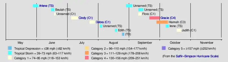 Tropical cyclogenesis began with the pre-season development of Tropical Storm Arlene in the Gulf of Mexico on May 28. Storm formation continued at a brisk pace for several weeks. In June, Tropical Storm Beulah and an unnamed hurricane formed; the latter hit Maritime Canada as an extratropical cyclone, causing the worst fishing-related disaster in New Brunswick in 100 years. Another pair of hurricanes, Cindy and Debra, formed in the month of July.[2] Tropical activity slowed down in August, with only Tropical Storm Edith forming during the month. Next, three tropical cyclones formed in September—Flora, Gracie, and Hannah—all of which attained hurricane status. Then, in October, Tropical Storm Irene and Hurricane Judith, the 1959 season's final storm, developed. The latter storm dissipated on October 21,[2] almost a month before the official end of the season on November 15.[1]