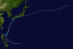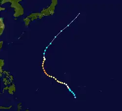 An area of severe weather formed near Kwajalein Atoll on October 30, and the Japan Meteorological Agency (JMA) began tracking it as a tropical depression on November 1. The Joint Typhoon Warning Center followed suit on November 5 after finding a closed circulation, and the depression received the name Emma. The depression strengthened into a tropical storm west of Guam on November 6 and gradually gained strength. Emma became a typhoon on November 11 near Luzon, and it reached its peak sustained winds of 205 km/h; 125 mph (110 kn) later that day. The typhoon turned northeastwards and grazed Okinawa the next day. Emma steadily weakened and became extratropical on November 13, and the JMA ceased tracking the storm on November 15.