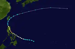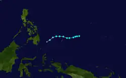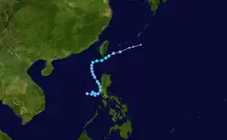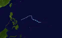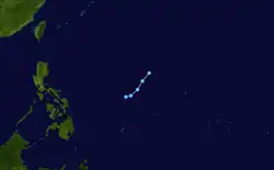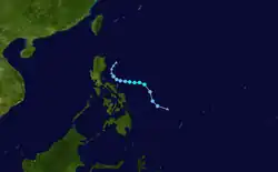 A tropical depression formed east of the Philippines on August 25, drifting northward before generally moving west. The system peaked as a tropical storm with winds of 75 km/h (45 mph) on the that same day. Kate gradually weakened throughout its lifespan after its peak as it recurved northeastward, degrading to a tropical depression on August 26, before dissipating by August 27.[30]