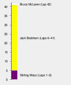 Brabham took the lead from Moss while his teammate McLaren followed in second for most of the race. Midway through, with half the field out due to mechanical problems, Brabham slowed to allow McLaren to close up to him, and Trintignant's Rob Walker Cooper began taking huge bites off their lead, as his pit crew kept him informed of his position.