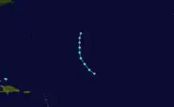 For several days, a weak low pressure area moved across the tropical Atlantic, which organized into a tropical storm on September 1 to the northeast of the Lesser Antilles. That day, peak winds were estimated at 45 mph (72 km/h), based on reports from ships and the Hurricane Hunters. The storm moved northward and weakened. On September 3, the system was absorbed by an approaching cold front. The storm was added to the Atlantic hurricane database in 2016.[6]