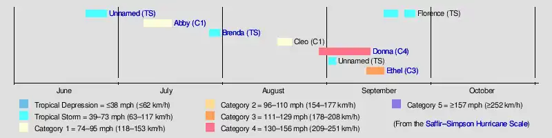 Season activity began on June 23, with the development of an unnamed tropical storm. Tropical cyclogenesis resumed in July with Hurricane Abby between July 10 and July 16, followed by Tropical Storm Brenda from July 28 to July 31. In mid-August, Hurricane Cleo developed and had an uneventful duration. At the end of that month, Hurricane Donna formed and lasted into mid-September; it was the strongest tropical cyclone of the season, peaking as a Category 4 hurricane. There was a Category 3 hurricane in September, Ethel, which briefly existed in the Gulf of Mexico. The last storm of the season, Tropical Storm Florence, dissipated on September 25, over a month before the official end of the season on November 15.[2][4]