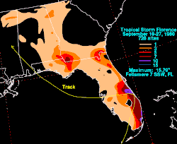 On Grand Bahama, 5.48 inches (139 mm) of rain fell in only 6 hours.[30] The storm dropped rainfall across Florida, though the heavier amounts were mainly on the Atlantic coast. Precipitation peaked at 15.79 inches (401 mm) near Fellsmere, while rainfall reached 10 inches (250 mm) in some areas of the Miami metropolitan area.[31] Although Florence was a depression at landfall,[4] sustained winds between 35 and 40 mph (56 and 64 km/h) were recorded in Ocean Ridge,[32] while a gust as high as 52 mph (84 km/h) was reported in Vero Beach.[4] In Jacksonville, a pressure gradient combined with Florida to produce tides of 2 to 3 feet (0.61 to 0.91 m) about normal.[30]