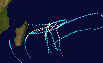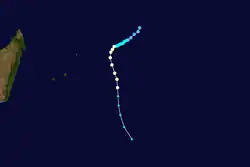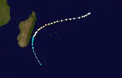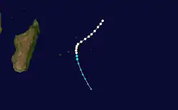 According to the MFR, Emma was a short-lived tropical storm that persisted southeast of Rodrigues,[10] although other warning agencies tracked it for much longer, following it from the Australian basin for 12 days.[11]